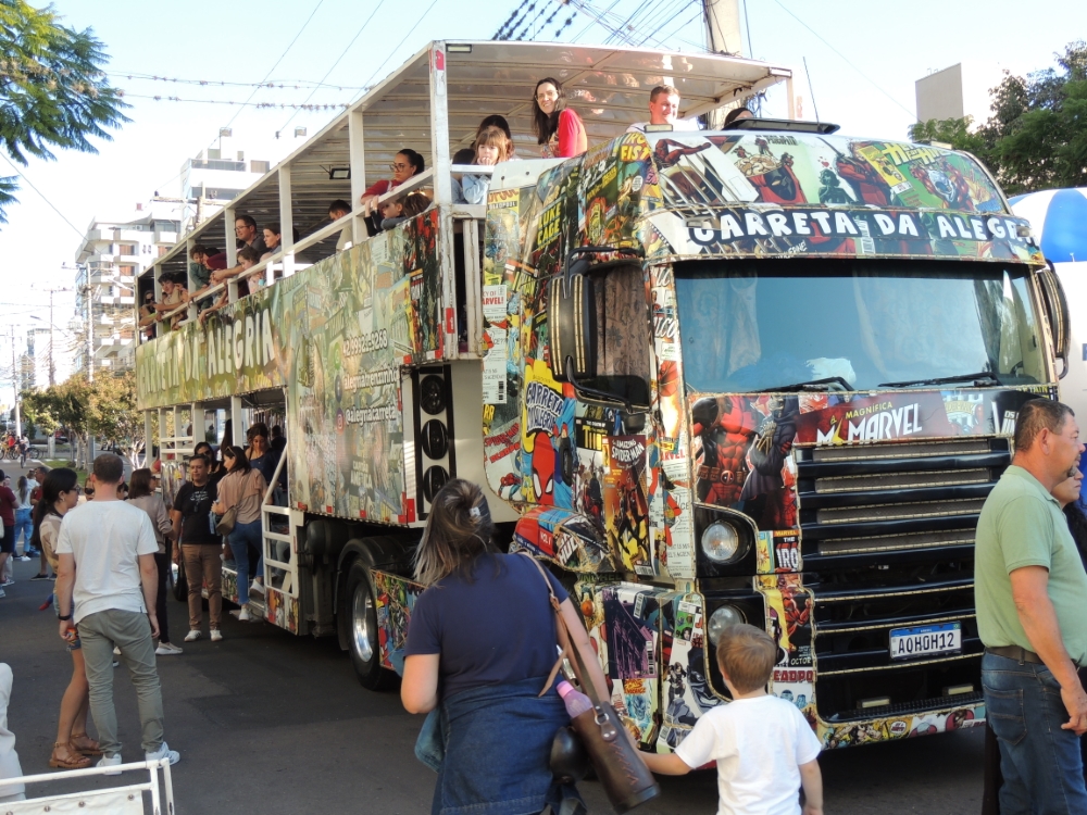 Brinquedos infláveis, pipoca e algodão doce completaram a atividade, garantindo a diversão das crianças. A iniciativa foi da Prefeitura, por meio do Departamento de Cultura, em parceria com o Sesc, a Câmara de Vereadores, entidades como Rotary, Lions e o Grupo Escoteiro São Luiz Gonzaga, além de voluntários.