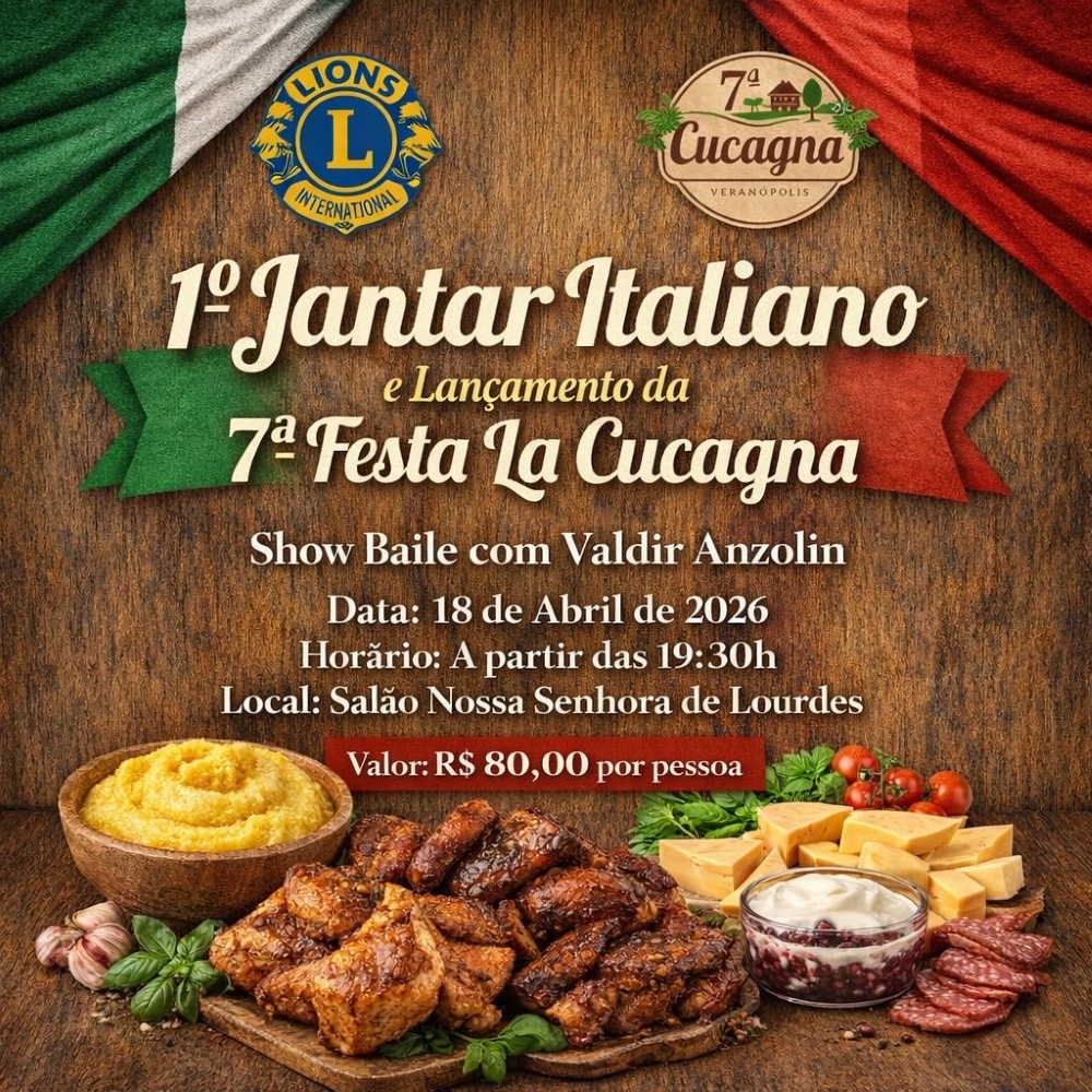 O Lions Clube de Veranópolis está convidando a população regional para participar do primeiro Jantar Italiano, evento que marcará o lançamento oficial da sétima festa La Cucagna. A proposta é reunir a comunidade em uma noite de celebração das tradições, com música e gastronomia colonial típica. A programação contará com show/baile de Valdir Anzolin, em comemoração às Mil Noites Italianas e aos 60 anos de carreira do artista, resgatando canções da tradição italiana. O evento será realizado no dia 18 de abril, a partir das 19h30min, no Salão da Gruta Nossa Senhora de Lourdes.